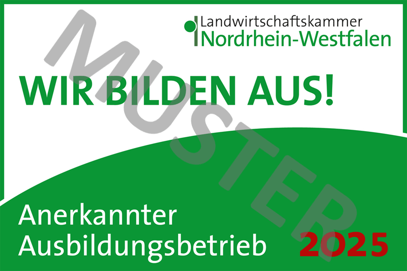 Ausbildungsbetriebe sollten ihr Engagement zur Sicherung des Fachkräftenachwuchses sichtbar machen. Die Landwirtschaftskammer Nordrhein-Westfalen stellt Betrieben, die für die Berufsausbildung in Berufen der Landwirtschaft oder der Hauswirtschaft unbefristet anerkannt sind, ein digitales Logo „Wir bilden aus! Anerkannter Ausbildungsbetrieb“ zur Verfügung. Damit können die Betriebe z. B. auf ihrer Homepage werben und ihr Engagement sichtbar machen.