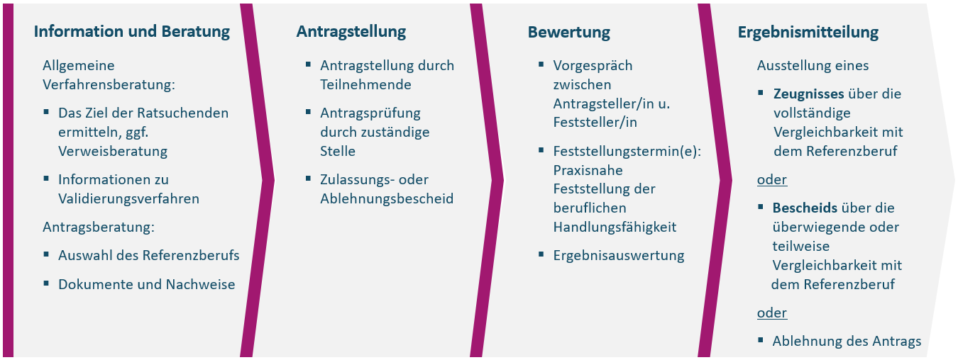 - vollständige Vergleichbarkeit: Die für die Ausübung des Referenzberufes erforderlichen Kompetenzen können vollständig festgestellt werden. Das Ergebnis wird in einem Zeugnis dargestellt.