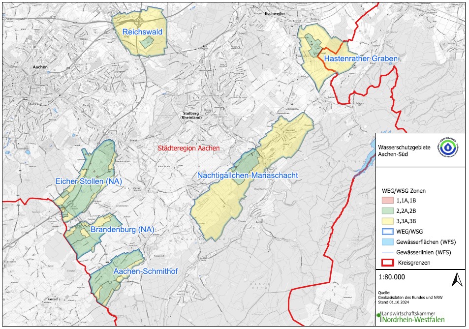Südöstlich von Stolberg und Eschweiler liegen in der Städteregion Aachen die Wasserschutzgebiete Nachtigällchen-Mariaschacht und Hastenrather Graben mit einer Gesamtgröße von ca. 1.800 ha. Die geologische Situation und Höhenlage ist ähnlich zu den Wasserschutzgebieten im Stadtgebiet Aachen, allerdings werden hier die landwirtschaftlichen Kooperationsflächen zu 74 % als Grünland genutzt.