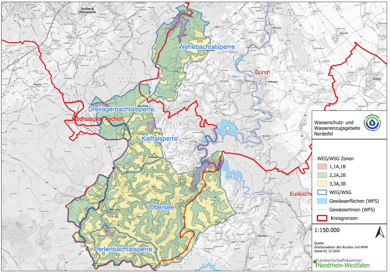 Eingebettet in den waldreichen Tälern und den teils drainierten Hochflächen der Nordeifel befinden sich die zu den Stauseen gehörenden Wassereinzugsgebiete Kalltalsperre sowie der zur Rurtalsperre Schwammenauel gehörende Obersee und die Perlenbachtalsperre. Die Wehebach- und Dreilägerbachtalsperre sind von Wasserschutzgebieten umgeben. Insgesamt wird eine Fläche von 23.000 ha an Wasserschutz- und Einzugsgebieten von der WAG Wassergewinnungs- und -aufbereitungsgesellschaft Nordeifel mbH betreut.