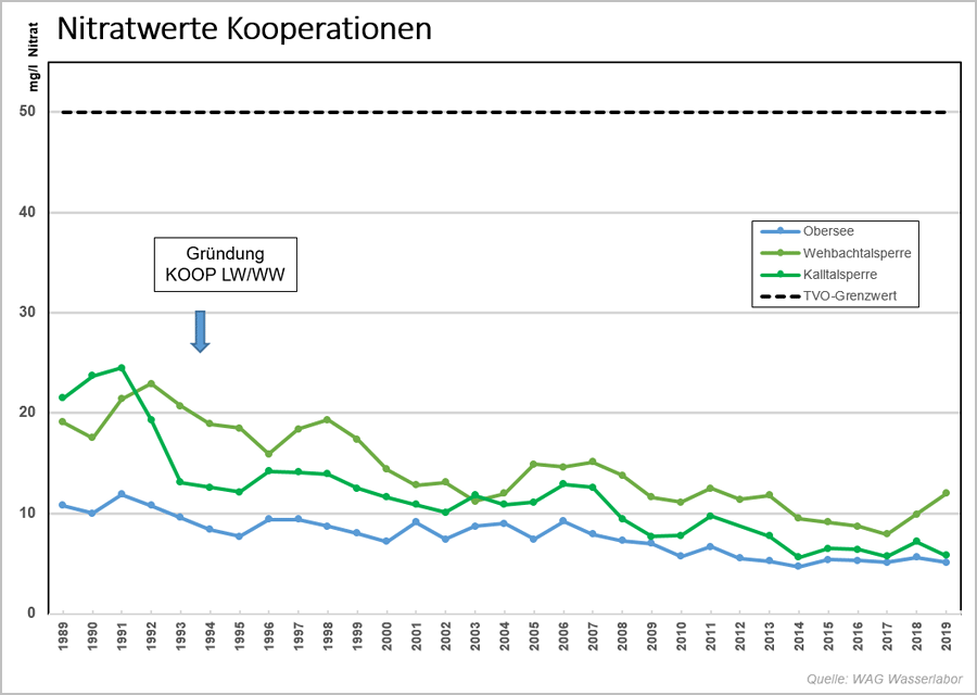 Langzeitauswertung der Nitratentwicklung in den Gebieten der Kooperationen Obersee, Wehebach- und Kalltalsperre (1989-2019)
