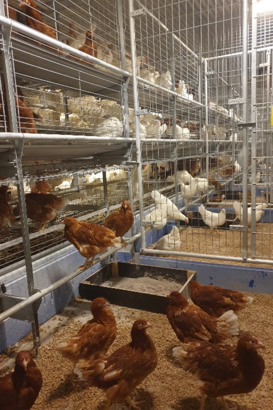 Einblicke in die neue Volierenanlage für Legehennen. Diese Abteile sind seit November 2021 bzw. Mai 2023 in Betrieb und werden vor allem für die Versuchsarbeit genutzt.