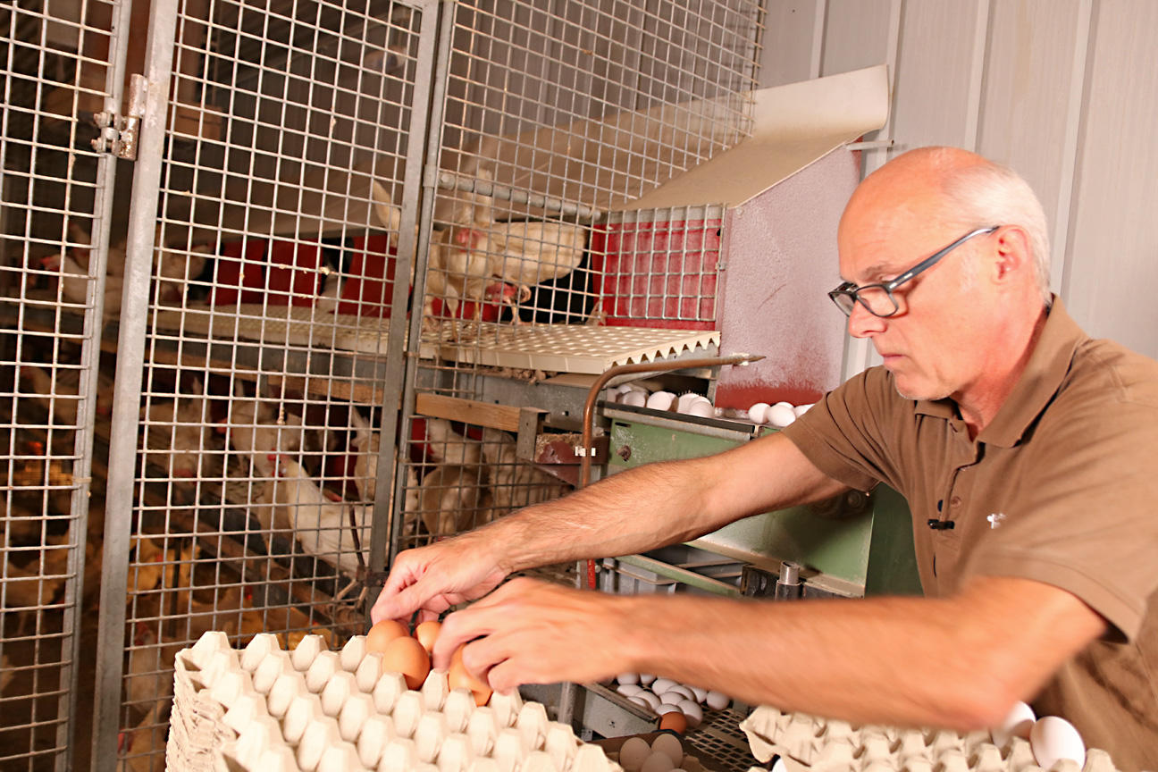 Die Eier werden täglich aus dem Stall gesammelt, kontrolliert und anschließend in die Packstelle gebracht. Dort werden sie erneut kontrolliert, sortiert und verpackt. Bei der Kontrolle der Eier ist die Durchleuchtung hilfreich, um Eier mit schwer erkennbaren Haarrissen in der Eischale oder inneren Einschlüssen auszusortieren.