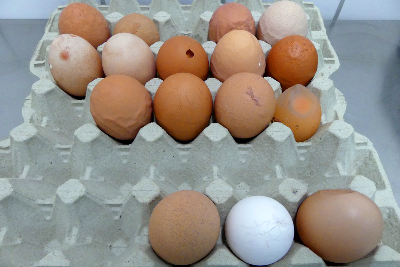 Nicht alle Eier kommen so aus dem Huhn, wie man es von Eiern aus dem Laden kennt. Manchmal sind einzelne Eier stark verschmutzt, deformiert, defekt, oder die äußere Verpackung – die Kalkschale – fehlt. Zu einem geringen Prozentsatz ist das ganz normal, weshalb diese Eier bereits im Stall aussortiert werden.