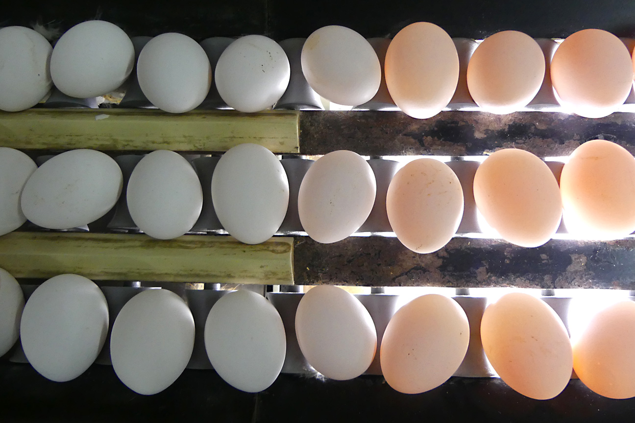 Die Durchleuchtung der Eier unterstützt dabei, die Eier mit schwer sichtbaren Haarrissen und inneren Einschlüssen auszusortieren.
