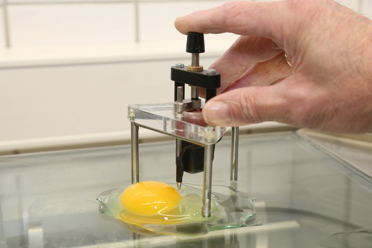 Für Versuchsfragestellungen wird mit dem Eiklarhöhenmesser die Eiklarhöhe im Abstand von ca. 1 cm vom Rand des Dotters bestimmt. Zusammen mit dem Eigewicht lässt sich dann die Eiklarqualität berechnen.