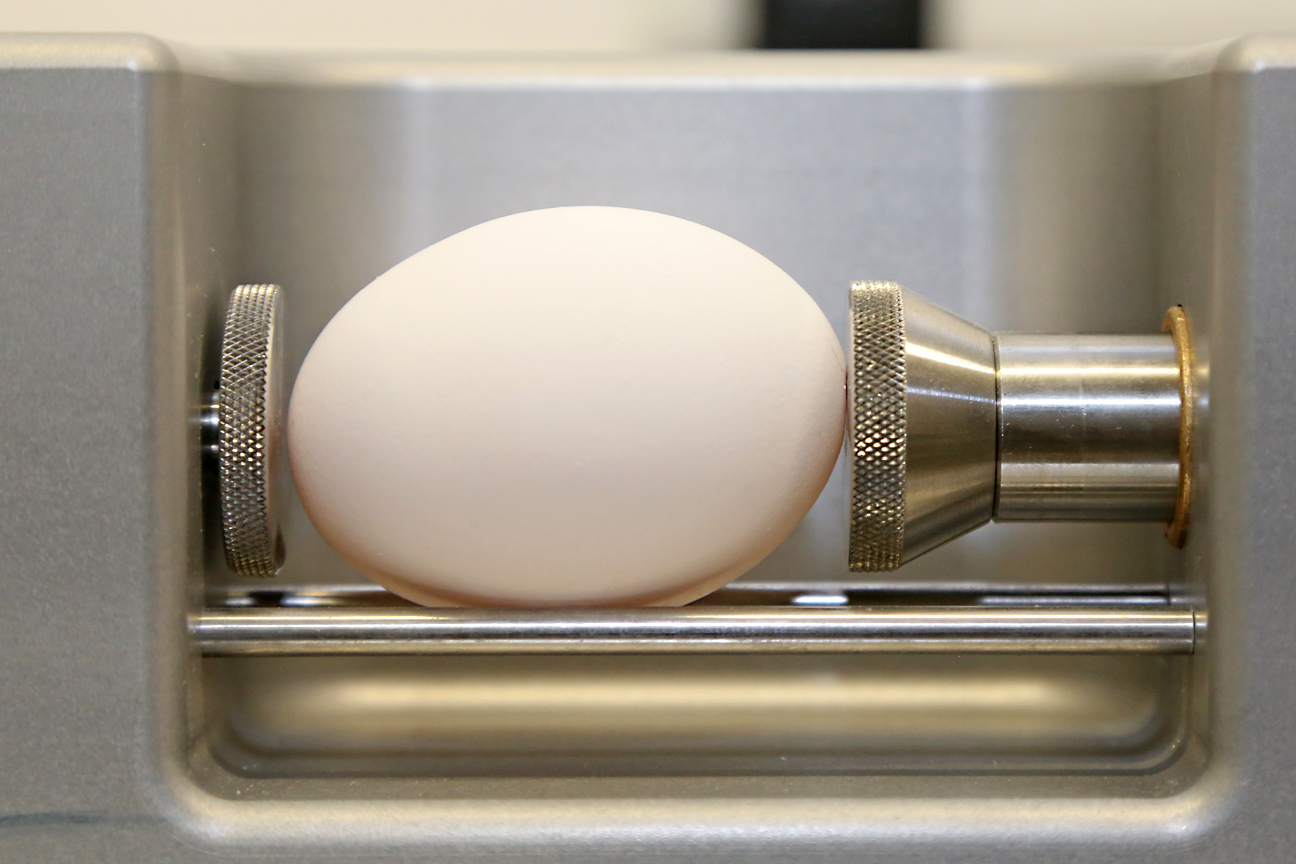 Um die Schalenstabilität zu messen, wird das Ei in den Eischalentester eingelegt. Dieser übt so lange Druck auf die Eischale aus, bis diese nachgibt. Die benötigte Kraft zur Durchbrechung der Schale dient als Parameter für die Bruchfestigkeit.