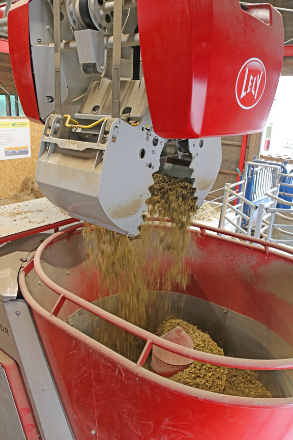 Die Befüllung des autonom fahrenden Futtermischers erfolgt durch einen stationären Hallenkran. Durch die intelligente Zusammenarbeit von Hallenkran und Futtermischer der mit einer Waage ausgestattet ist, werden die Bullengruppen bis zu sechs Mal täglich gefüttert. In festgelegten Zeitkorridoren startet das System eine Scanfahrt zur Ermittlung des Futtervorrats auf dem Futtertisch.