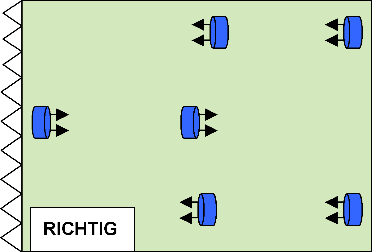- Ventilatoren saugseitig nah an die Giebelwand, besser zum kalten Giebel blasen