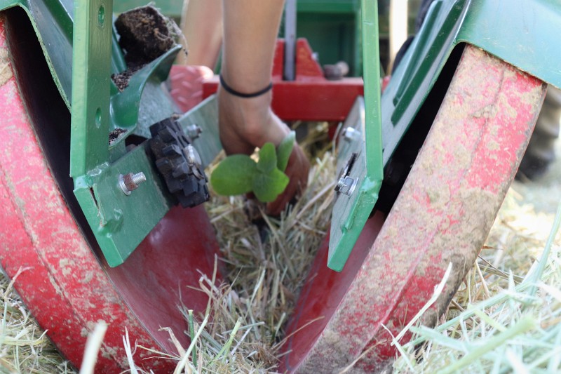 Spezielle Mulchpflanzmaschine „Mulchtec Planter“ (entwickelt auf dem Bio-Gemüsehof Dickendorf) ermöglicht direkte Pflanzung in geschlossene Mulchschichten
