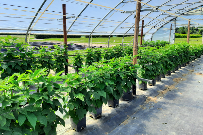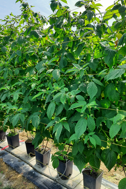 Herbsthimbeeren, die im Frühjahr als Topfgrünpflanzen gepflanzt wurden, werden im Spätsommer ihre volle Länge erreichen und Früchte tragen. Im Hintergrund sieht man die neu gezogenen Erdbeerdämme für die kommenden Erdbeerpflanzungen im Freiland.