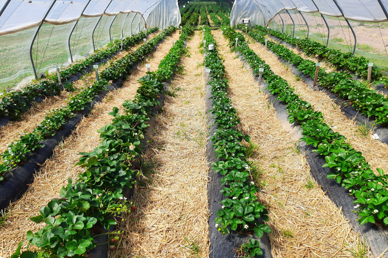 Regenkappen mit Graseinsaat unter den Stellagerinnen eigenen sich für spät gepflanzte remontierende Erdbeeren sehr gut. Das Klima ist dort im Sommer sehr gut.