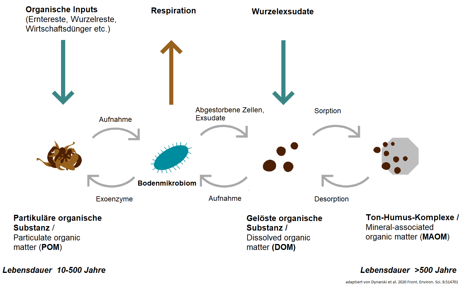 Der erste Paradigmenwechsel, der sich aus der neuen Humustheorie ergibt: Humus unterliegt einem kontinuierlichen Abbau. Der als Dauerhumus bezeichnete Teil ist keineswegs resistent gegenüber mikrobiellem Abbau, sondern nur solange geschützt wie er in Bodenaggregaten eingeschlossen (POM) oder an Tonmineralien sorbiert (Ton-Humus-Komplexe) vorliegt(4),(8). Der in der POM-Fraktion gespeicherte Kohlenstoff überdauert Jahrzehnte bis wenige Jahrhunderte im Boden, der in den Ton-Humus- Komplexen gespeicherte Kohlenstoff kann viele Jahrhunderte im Boden überdauern.