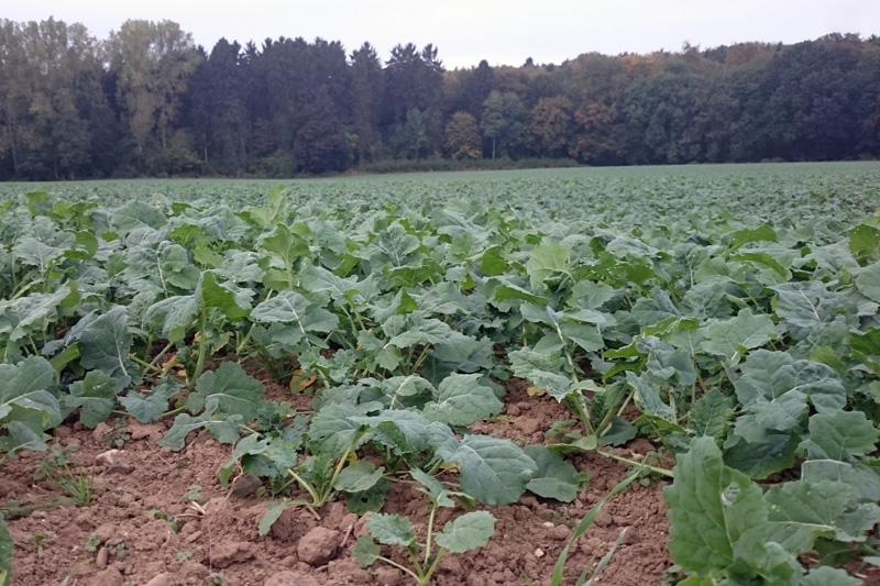 Aufgrund der Bodenbewegung während der Rodung der Vorkultur Kartoffeln können zum Beispiel Werte über 100 kg Nmin pro Hektar unter der Fläche in Buir sowie Schwerte nachgewiesen werden. Bei Flächen mit Zuckerrübe als Vorkultur lässt sich dieses Phänomen hingegen nicht nachweisen. Bei spät gesätem Winterweizen, wie etwa nach Mais, sind häufig kleine Mineralisationspeaks erkennbar. Zwei der drei Winterrapsbestände haben sich nach der trockenen Periode scheinbar gut entwickelt und haben mehr als 50 kg Stickstoff aufgenommen. Die Fläche in Vettweiß-Gladbach wurde im Oktober noch einmal gedüngt, sodass die Aufnahmerate an Stickstoff hier durch den gedüngten Stickstoff überdeckt wird. Bei den zwei Zuckerrübenflächen lassen sich geringe Mengen Mineralisationsstickstoff nachweisen. Die Werte haben sich gegenüber dem Vormonat damit leicht erhöht. Hier ist wahrscheinlich abgestorbene Blattmasse, die umgesetzt wird, der Grund. Eine Aufnahme von Stickstoff durch die Pflanzen dürfte mittlerweile weitestgehend beendet sein. Viele Zwischenfruchtkulturen sowie -mischungen, unter anderem Greening-Begrünungen, haben innerhalb des Referenzeitraumes noch moderat Stickstoff aufgenommen und in der lebenden Biomasse eingelagert.