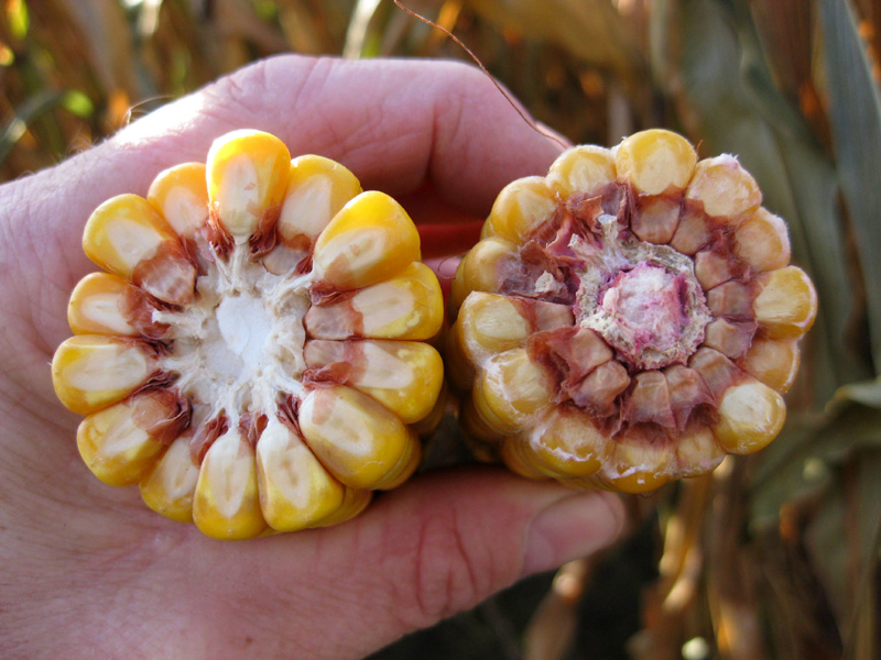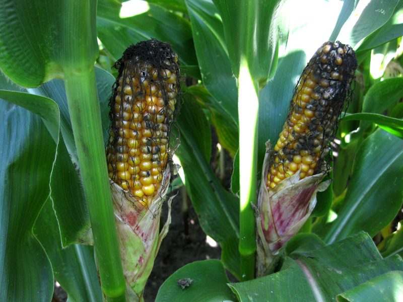 Neben den auf die Kälte zurückzuführenden Keimlings- und Pflanzenausfällen und den daraus resultierenden dünnen Beständen, waren die Bestände aber oft auch durch den Trockenstress bis zur Blüte gekennzeichnet. Vielfach war das Längenwachstum vermindert. Nach dem Wiederergrünen und guten Bedingungen im August waren besonders in dünneren Beständen Pflanzen mit ausgeprägter Mehrkolbigkeit zu finden. Sortenspezifisch reichten die kurz angelegten Lieschblätter nicht aus, um die Kolbenspitzen zu bedecken. Die freiliegenden Körner wurden unter feuchten Bedingungen schnell von Schwärzepilzen besiedelt. In den Körnermaisversuchen war dies insbesondere bei den Sorten NK Falkone und Arabica zu beobachten.