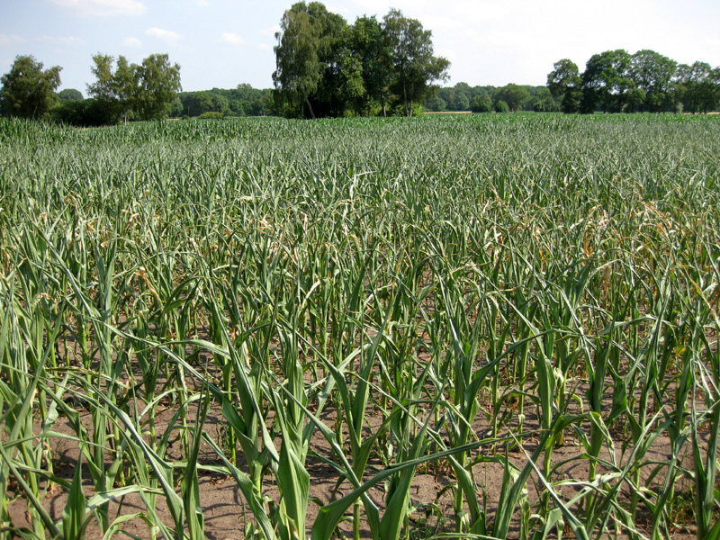 Bessere Wachstumsbedingungen fand der Mais erst mit der Erwärmung ab Mitte Juni. Die Entwicklung kam bei weiter ausbleibenden Niederschlägen dann aber schnell durch Trockenstress ins Stocken. Auf den Sandböden rollten oftmals erst knie- bis hüfthohe Bestände und stellten das Wachstum ein. Mit den ab der ersten Julidekade einsetzenden Niederschlägen konnten dann aber auch diese Bestände noch Fahnen schieben und bei stark gestauchtem Längenwachstum auch Kolben ansetzen. Spätsaaten und spätere Sorten konnten das Wasser vielfach noch besser nutzen und in Ertrag umsetzen.