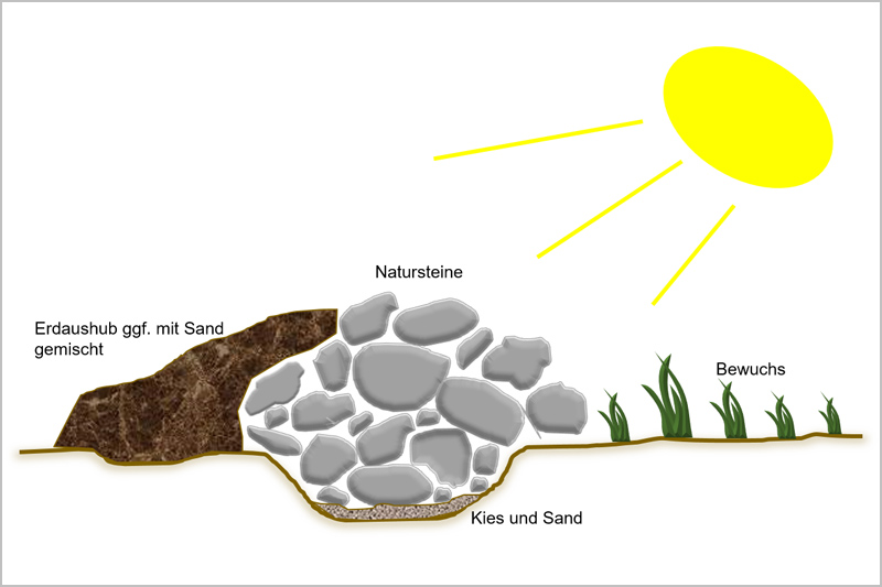 - Mehrere Steinhaufen unterschiedlicher Größe im Abstand von 20-30 m können Lebensräume miteinander verbinden.