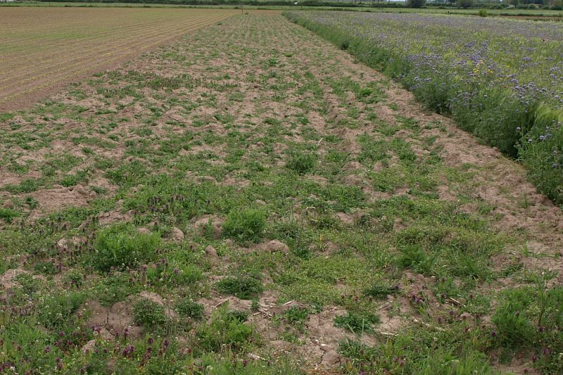 Für die Neuanlage von Rohbodenflächen bieten sich in erster Linie Teilbereiche von sogenannten Eh da-Flächen an - sowohl auf oder an landwirtschaftlichen Nutzflächen, Landschaftselementen und Wegen sowie auch im Bereich der Hofstelle selbst. Zur Herstellung empfiehlt sich eine maschinelle Bearbeitung beispielsweise mit Grubber oder Fräse und die Fläche in räumlicher Nähe zu Blühstreifen oder blütenreichen Strukturen anzulegen, um mit einem gleichzeitigen Angebot von Nist- als auch Nahrungshabitaten Insekten in besonderer Weise zu fördern. Je nach Aufwuchs sollten die Rohbodenflächen zwei bis drei Jahre liegengelassen und dann benachbart neue Flächen anlegt werden, sodass unterschiedliche Aufwuchsstadien gleichzeitig vorhanden sind.