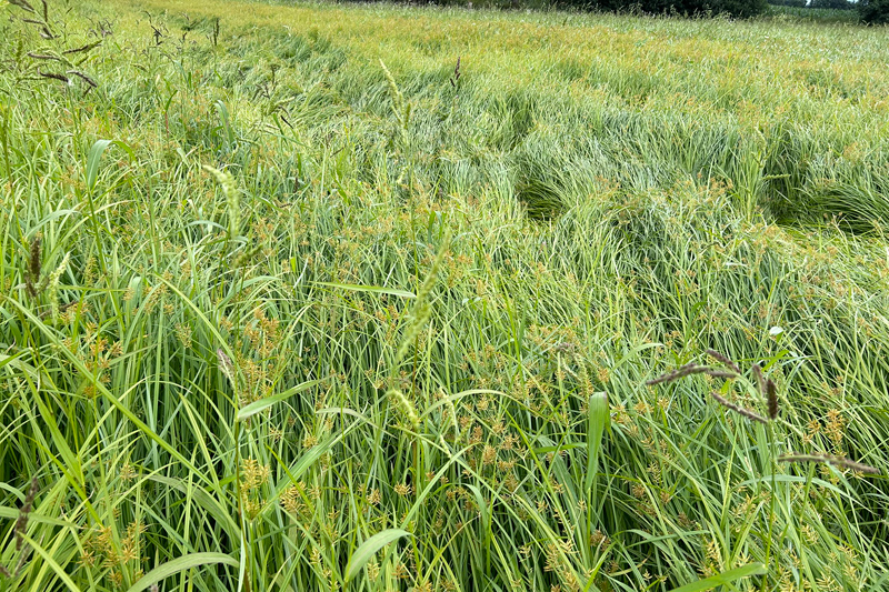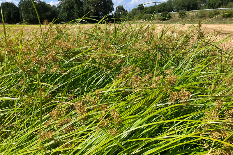 Das Erdmandelgras (Cyperus esculentus) breitet sich in Nordrhein-Westfalen rasant aus und stellt, wenn es sich einmal etabliert hat, eine neue, massive Herausforderung für den Ackerbau dar. Als invasive C4-Pflanze ist es extrem anpassungsfähig, schwer zu bekämpfen und kann ganze Flächen langfristig unbrauchbar machen. An den Wurzeln bildet es lange unterirdische Ausläufer, sogenannte Rhizome, an denen sich die etwa 1-2 cm großen, braunen Erdmandeln bilden. Einmal etabliert, sind die Mandeln kaum noch vollständig zu entfernen – daher ist Prävention bei diesem Ungras das oberste Gebot. Ein frühzeitiges Erkennen und konsequente Maßnahmen sind entscheidend, um eine flächenhafte Ausbreitung zu verhindern.