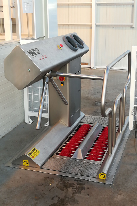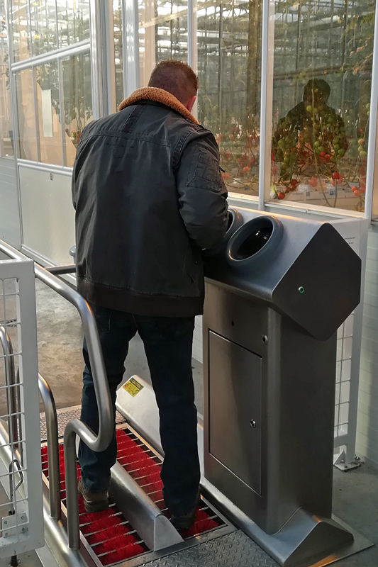Für Risiko-Betriebe, die bereits Befall mit ToBRFV hatten oder Tomaten anderer Betriebe sortieren bzw. verpacken, empfiehlt es sich, ein individuell auf den Betrieb zugeschnittenes Hygienekonzept in Verbindung mit der Beratung oder Spezialfirmen zu erarbeiten. Hygiene-Schleusen und Boden-Desinfektionsmatten, wie in niederländischen Spezialbetrieben weit verbreitet, bilden einen wichtigen Bestandteil solcher Hygienekonzepte. Eine strikte Trennung zwischen Produktion und Sortierung/Verpackung fremder Tomaten mit zwischengeschalteter Desinfektionsschleuse schützt vor Einschleppung. Am besten wäre auch eine Trennung der Arbeitsmannschaften z. B. durch verschiedenfarbige Betriebskleidung.