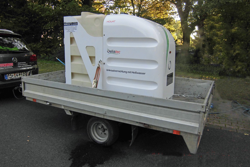 ca. 240 l Wasser pro Stunde (je nach Unkrautbesatz); rechtzeitig vor dem Ende des Wasservorrats schaltet die Steuerung automatisch ab die Aufnahme von Oberflächenwasser ist möglich |