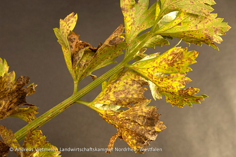 Auf den Blättern bilden sich gelblich braune bis graubraune Flecken, in deren Zentrum schwarze Pünktchen (Fruchtkörper) zu erkennen sind. Später vergilben die Blätter und sterben vorzeitig ab. Bei Knollensellerie bleibt der erwünschte Knollenzuwachs aus.