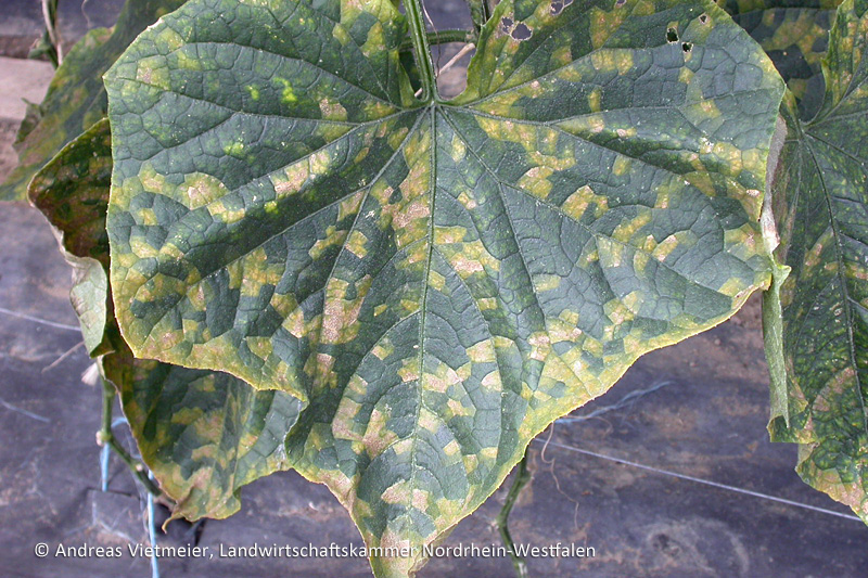 Verursacher der beschriebenen Blattschäden ist der Pilz Pseudoperonospora cubensis. Er befällt Gurken vor allem dann, wenn die Blätter längere Zeit feucht sind. Erhöhte Infektionsgefahr liegt daher in niederschlagsreichen Jahren vor, aber auch bei stark schwankenden Tag- und Nachttemperaturen mit verstärkter Taubildung.