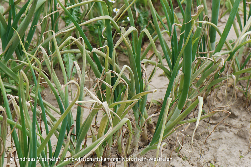 Dennoch sollte man darauf achten, dass Zwiebeln nicht über mehrere Jahre an der gleichen Stelle angebaut werden, da der Pilz dauerhaft im Boden überleben kann. Befallene Pflanzenreste möglichst bei der Ernte vom Beet entfernen und nicht in den Boden einarbeiten. Ein ausreichend weiter Sä- bzw. Pflanzabstand und eine möglichst windoffene Lage können das Befallsrisiko ebenfalls mindern, da hierdurch das Abtrocknen des Zwiebellaubes nach Niederschlägen erleichtert wird.