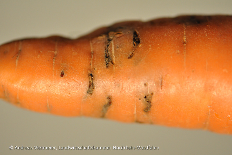 Die Blätter werden rötlich, vergilben und verwelken. Der Möhrenkörper ist von rostbraunen Fraßgängen durchzogen, worin oft noch die 6-8 mm langen, weißen Maden zu finden sind (Eisenmadigkeit).