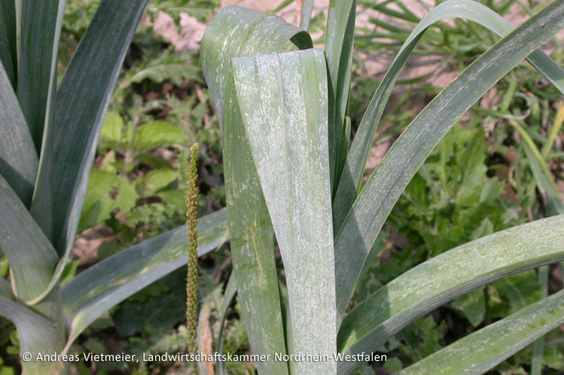 Thripse sind sehr kleine, ca. 1 mm große, grauschwarze Tiere, die insbesondere im Hochsommer bei trocken-warmer Witterung häufig an Zwiebelgewächsen auftreten. Neben Porree und Speisezwiebeln kann auch Schnittlauch befallen werden. Durch die Saugtätigkeit der Schädlinge entstehen die beschriebenen Blattscheckungen.