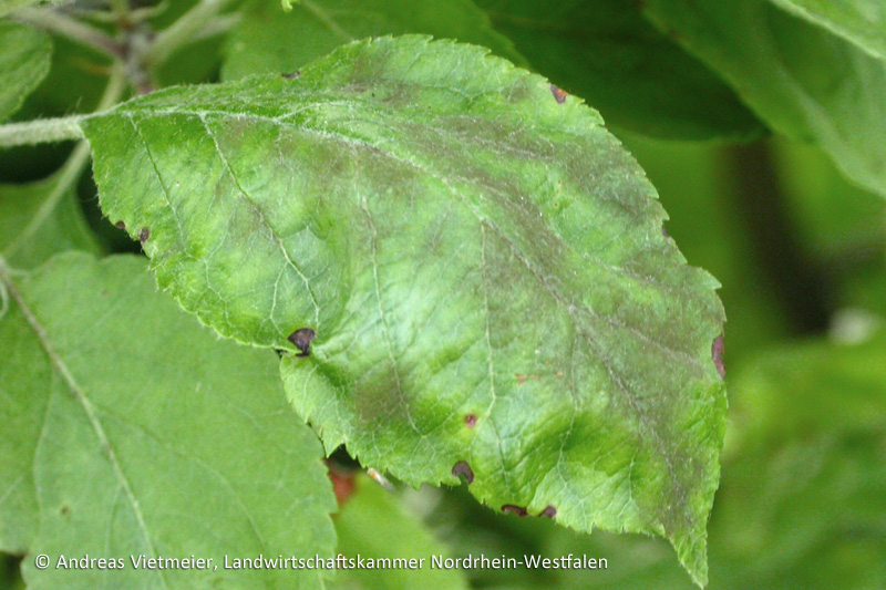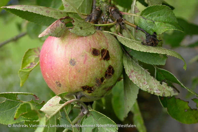 Der Schorfpilz (Venturia inaequalis) überwintert im Falllaub. Etwa zur Zeit des Knospenaustriebs werden die Sporen des Pilzes, die sich in den Fruchtkörpern im alten Falllaub bilden, ausgeschleudert. Sie verursachen die ersten neuen Schorfinfektionen. An erkrankten Blättern bilden sich dann während der gesamten Vegetation fortlaufend neue Sporen, die auch die Früchte befallen. Ein stärkeres Auftreten dieser Krankheit ist vor allem in Jahren mit häufigen Niederschlägen zu erwarten.