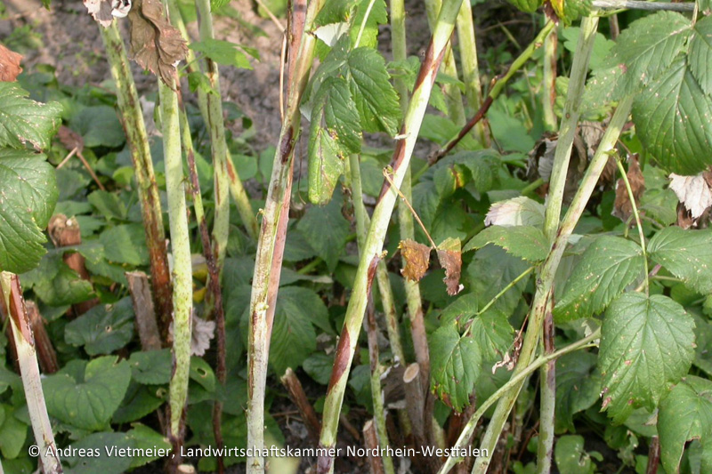 Im Frühsommer entstehen im unteren Bereich der Himbeerruten rötlich braune bis blauviolette Flecken (vor allem im Bereich der Knospen), die sich zunehmend vergrößern und weite Teile der Rute umschließen können. Die Rinde stirbt an den verfärbten Stellen ab und löst sich anschließend vom Holz. Die Rute verkümmert nachfolgend. Sie treibt im darauffolgenden Frühjahr nur noch kümmerlich aus.