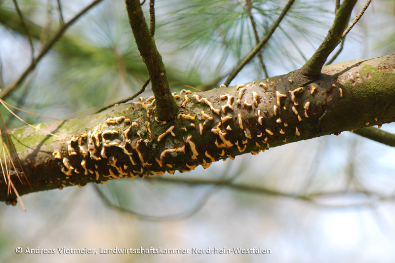 Der Schadpilz (Cronartium ribicola), der den Johannisbeersäulenrost hervorruft, gehört zu den wirtswechselnden Rostpilzen, da er im Herbst auf fünfnadelige Kiefern (z. B. Weymouthskiefern) überwechselt und dort überwintert. An Kiefern werden von dem Pilz spindelförmige Anschwellungen an Ästen verursacht, die im Frühjahr blasenartig aufquellen, was auch zur Namensgebung dieser Krankheit an Kiefern führte ("Weymouthskiefernblasenrost"). Aus den blasenartigen Anschwellungen werden dann im Frühjahr erneut Pilzsporen freigegeben, die wiederum Johannisbeeren infizieren. Nicht auszuschließen ist, dass der Pilz auch in abgefallenem Johannisbeerlaub überdauern kann.