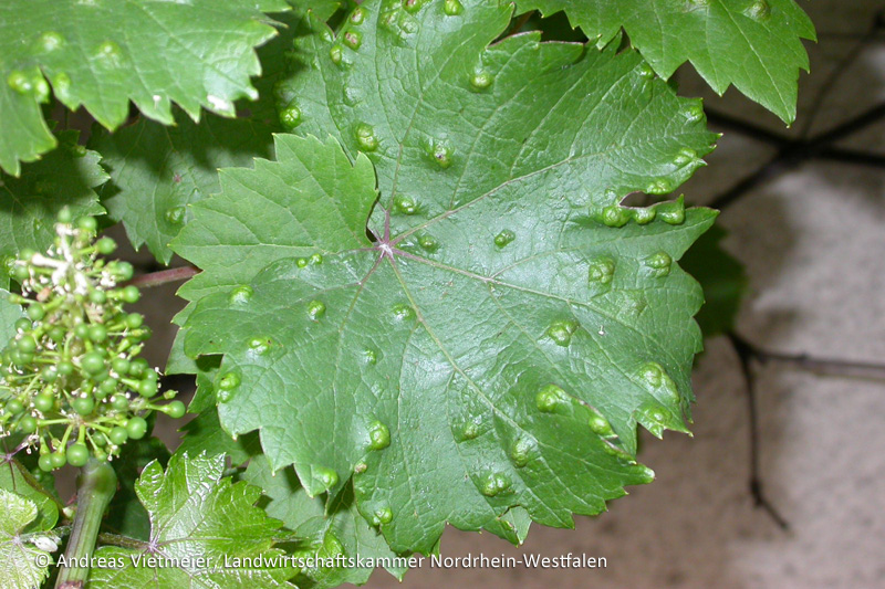 Auf den Blättern von Weinreben zeigen sich blasen- oder pockenartige Aufwölbungen. Diese sind meist grün oder gelblich grün gefärbt, können aber auch leicht rötlich sein. An den Unterseiten sind die Stellen im Bereich der Pocken von einem weißlichen, später auch bräunlichen, filzartigen Belag bedeckt.