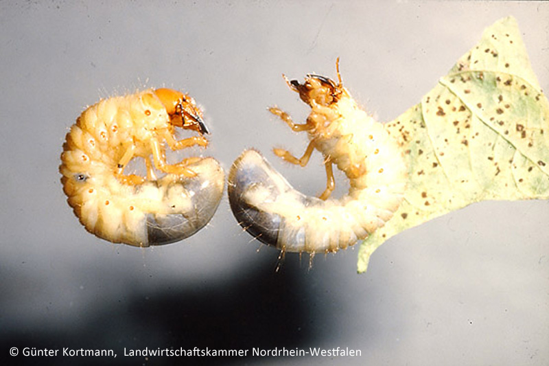 Ähnlich schwierig ist es, wenn Käferlarven im Boden gefunden werden. Hier bringt auch ein Walzen oder stärkeres Beregnen der befallenen Flächen kaum Erfolg. Häufig bleibt ebenfalls nur eine Neueinsaat. Einen gewissen Erfolg könnte man allerdings gegen die Engerlinge des Gartenlaubkäfers erzielen. Auch hier zeigen bestimmte Nematoden (Heterorhabditis bacteriophora) eine recht gute Wirkung.