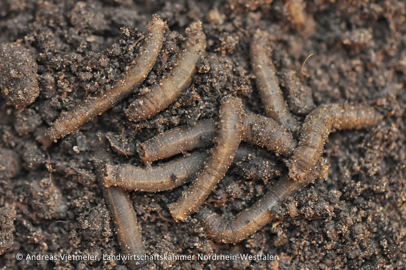 Bei den "Wiesenwürmern" oder Tipula-Larven handelt es sich um die Larven der Wiesen- oder Sumpfschnake. Die bis 4 cm langen, graubraunen, walzenförmigen "Wiesenwürmer" können bei Massenbefall die Gräser erheblich schädigen. Die Pflanzen werden - besonders nachts - dicht über dem Boden abgefressen; bei bedecktem Wetter auch am Tage. Von August bis September legen die Schnaken ihre Eier in den Rasen ab. Nach wenigen Wochen schlüpfen die Larven. Der eigentliche Schadfraß findet dann im April und Mai des Folgejahres statt. Etwa im Juni erfolgt die Verpuppung, bis dann im August erste neue Schnaken schlüpfen.