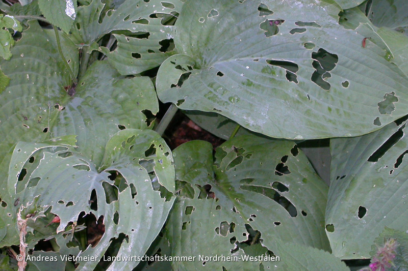 Schneckenfraß entsteht an den Blättern meist vom Blattrand aus, wobei eine Vielzahl von Pflanzenarten betroffen sein kann. Neben den Fraßstellen hinterlassen die Schnecken zusätzlich silbrige Schleimspuren auf den Pflanzen und dem Boden. Junge Pflanzen werden meist von unten her angefressen, beginnen zu welken und lassen sich anschließend leicht herausziehen.