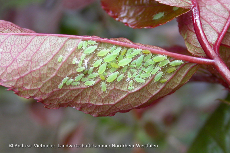Die grün, gelblich oder schwarz gefärbten Blattläuse sitzen meist in großen Kolonien auf der Unterseite der Blätter oder an den Triebspitzen. Bei sommerlichen Temperaturen kommt es schnell zu einer massenhaften Vermehrung der Läuse.