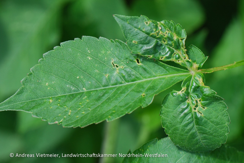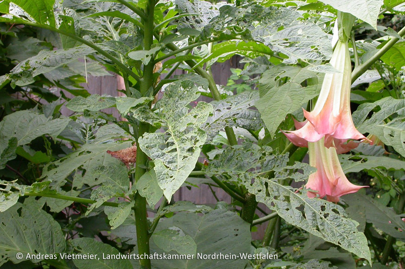 Jüngere Blätter von Zierpflanzen sind deformiert, verkrüppelt und löchrig-zerrissen. Die Blattschäden treten vor allem bei Engelstrompeten, Fuchsien, Dahlien, Chrysanthemen und Rosen auf.