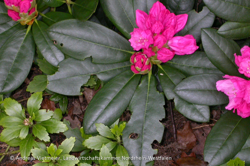Blätter von Ziergehölzen und anderen Zierpflanzenarten zeigen typische buchtenartige Fraßspuren an den Rändern, die von den erwachsenen Käfern des Dickmaulrüsslers verursacht werden. Besonders häufig befallen werden z. B. Rhododendron, Kirschlorbeer, Eibe, Efeu oder bestimmte Staudenarten (u. a. Bergenien). Den größten Schaden verursachen allerdings die Larven, die an den Wurzeln bzw. am Wurzelhalsbereich fressen. Pflanzen mit stärkerem Wurzelfraß sterben komplett ab.