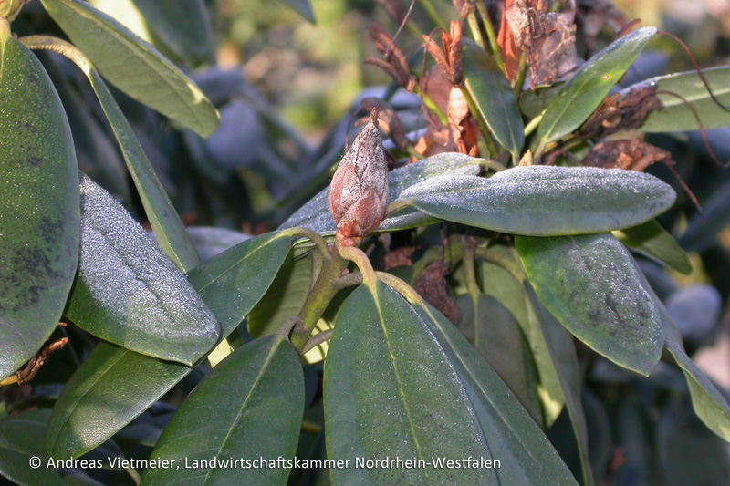 Die Knospen von Rhododendren verbräunen im Frühjahr und sterben ab. Bei genauerer Betrachtung erkennt man auf ihnen nach einiger Zeit zusätzlich kleine, schwarze, stachelartige Gebilde, bei denen es sich um die Fruchtkörper des für das Absterben verantwortlichen Schadpilzes (Pycnostysanus azaleae) handelt. Übertragen und verbreitet wird dieser Pilz vermutlich durch die häufig an Alpenrosen anzutreffenden Rhododendronzikaden (Graphocephala fennahi).