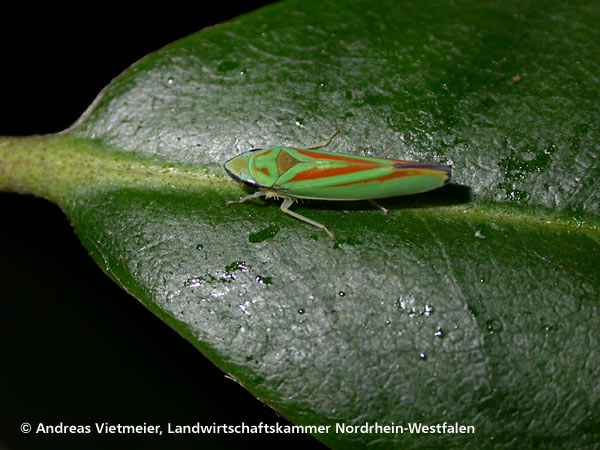Diese 8 bis 9,5 mm langen, auffällig grün gefärbten und mit roten Streifen auf den Flügeln versehenen Rhododendronzikaden treten etwa ab Mitte Juni an Rhododendron auf. Deren grünlichgelbe Larven sind bereits im Mai zu finden, vornehmlich auf den Blattunterseiten. Die Zikaden selbst verursachen zwar keinen direkten Schaden, jedoch werden bei der im Herbst stattfindenden Eiablage unter die Knospenschuppen von Rhododendren kleine Verletzungen verursacht, in die der Schadpilz des Knospensterbens eindringen kann. Infizierte Knospen entwickeln sich nicht weiter und sterben im nachfolgenden Frühjahr ab. Möglicherweise kann eine Infektion der Knospen aber auch ohne Mitwirkung dieser Zikaden stattfinden. Vor allem Pflanzen auf ungünstigen Standorten (Staunässe, dichter Stand) sind stärker gefährdet.