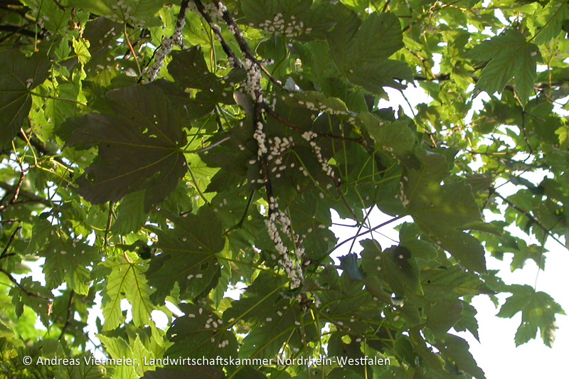 Auf Blättern und Trieben verschiedener Ziersträucher (z. B. Hortensie, Magnolie) sowie an Blättern, Ästen und Stämmen von Laubbäumen (Linde, Ahorn, Rosskastanie, Ulme) sind auffällig bräunliche bis weißliche Schildläuse zu finden. Obwohl die Tiere an den Pflanzen saugen und sich massenhaft vermehren, entsteht eigentlich kein nennenswerter Schaden (außer klebrigen Honigtauausscheidungen). Als störend wird häufig jedoch deren Anwesenheit empfunden.
