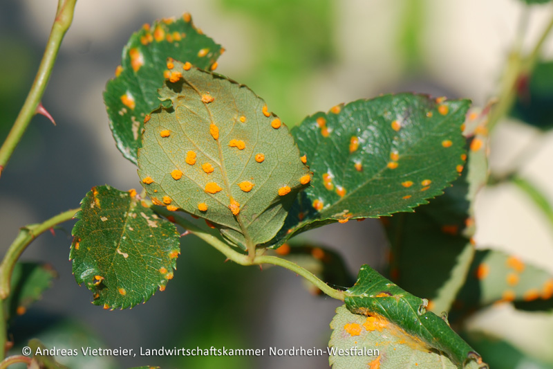 Rosenrost: gelblich orange Flecken auf der Blattoberseite; blattunterseits orange Sporenlager, die sich später braunschwarz verfärben; vorzeitiger Blattfall.