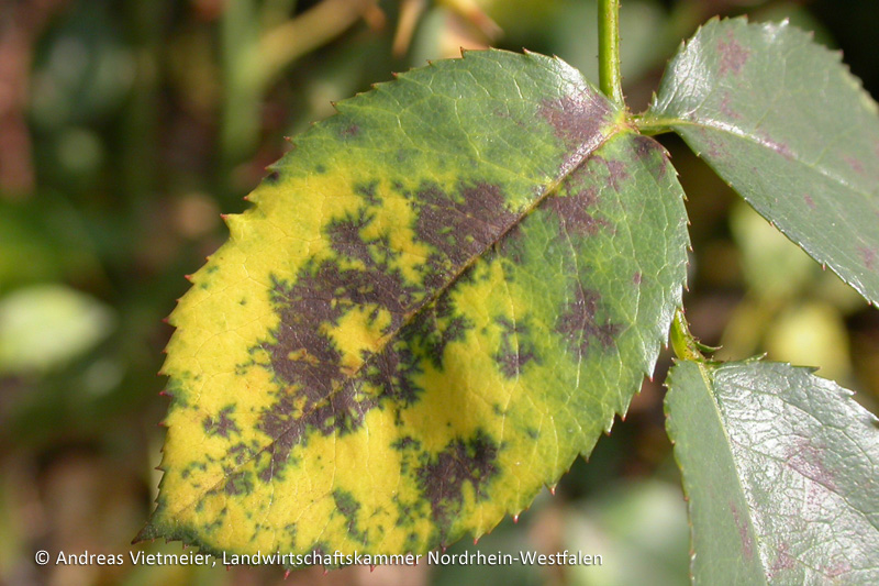 Sternrußtau: auf den Blättern unregelmäßige violettschwarze Flecken mit sternförmig ausgezacktem Rand; Blätter vergilben sehr schnell und fallen vorzeitig ab.