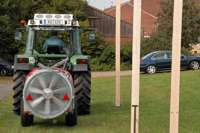 - Eine angepasste Gebläseleistung, da bei zu hoher Gebläseleistung die Tropfen durch die Krone hindurch geblasen werden und sich nicht anlagern können