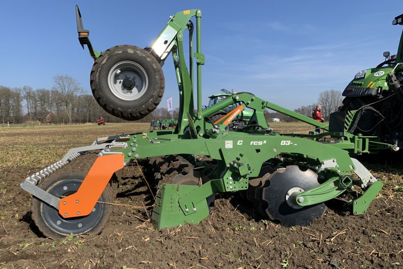 Amazone CatrosXL: Die in Köln einzige vertretene Scheibenegge der Firma Amazone zeichnet sich durch die integrierte, vorlaufende Messerwalze aus. Diese zerkleinert den stehenden Bestand, bevor die 61 cm großen Scheiben den Boden schneiden. Ab 7 cm konnte ein flächiger Schnitt des Scheibeneggenfeldes erzielt werden. Die Messerwalze trennt die Pflanzen bei ausreichend Bodengegendruck effektiv in kleine Teile und ist auch mit höheren Beständen zurechtgekommen. Die Messerwalze lässt sich hydraulisch ein- und ausschwenken und ist zudem mit Druck beaufschlagt, um nicht nur über den Boden zu rollen, ohne Einwirkung auf die Pflanzen.