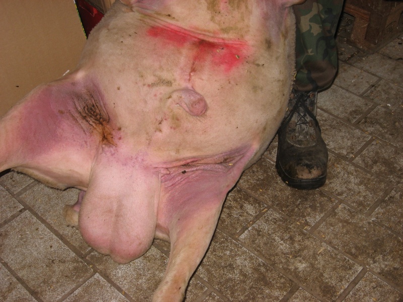 Flächige Rötungen an den Innenflächen der Hinterschenkel mit punktförmigen Blutungen insbesondere im Bereich des Hodensackes