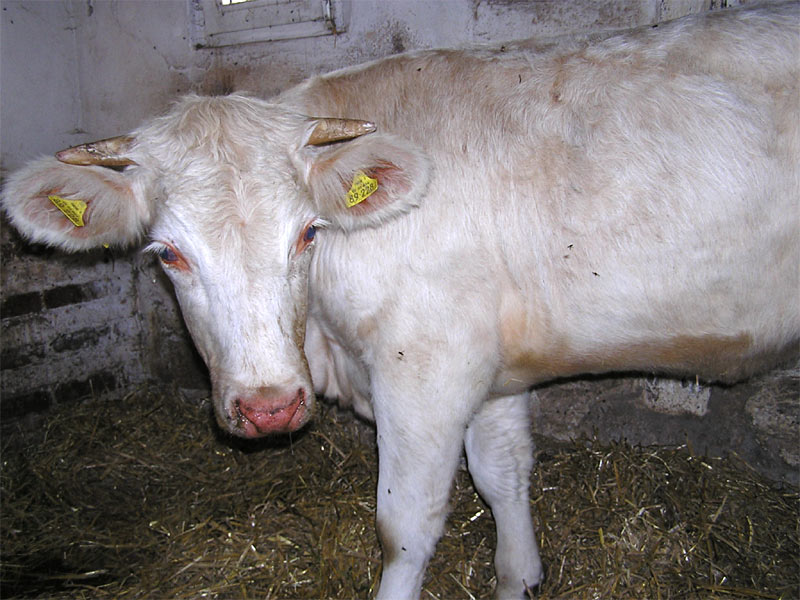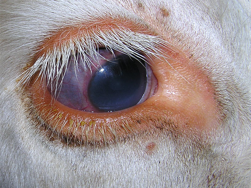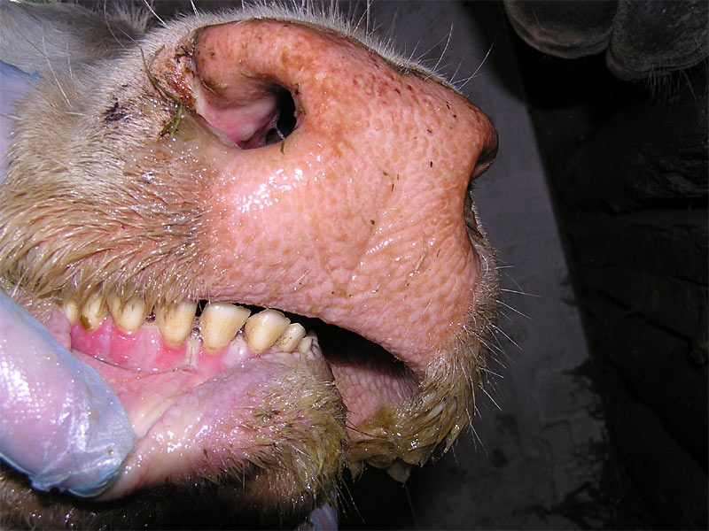 Nasen-, Maulschleimhäute und Zunge waren flächig stark entzündlich gerötet. Im der Bereich der Zahnhälse konnte eine deutliche zirkuläre Rötung festgestellt werden, wie man es auch bei BVD antrifft (Bild 2). Beide Augenlider waren geschwollen (Lidödeme), die Lidbindehäute entzündlich-eitrig gerötet und an beiden Augen war eine massive, milchig-trüb-opaleszierende Hornhauttrübung festzustellen, die zur Erblindung des Tiere geführte (Bild 3). Durch die Erkrankung sank das Körpergewicht von 450 kg auf 380 kg, Zwischenzeitlich verbesserte sich das Allgemeinbefinden wieder und es waren sogar Zunahmen zu verzeichnen.
