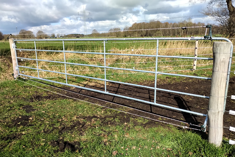 Die Höhe der Weidetore richtet sich nach dem Niveau der obersten Litze. Das Tor ist zu elektrifizieren um einen Schutz vor Untergraben und Überklettern sicherzustellen, hierzu gibt es entsprechende Elektrifizierungssets. Gegen Fahrspuren oder Bodenunebenheiten bieten ausgelegte Waschbetonplatten, Rasengittersteine oder eine Pflasterung weiteren Schutz.